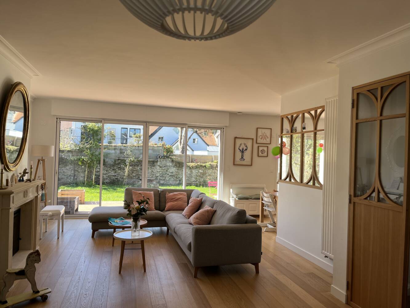 La grande baie vitrée à l’arrière ouvre généreusement le salon sur le jardin, baignant la pièce de lumière naturelle tout au long de la journée. Le choix d’un parquet bois chaleureux renforce l’atmosphère conviviale de l’ensemble.