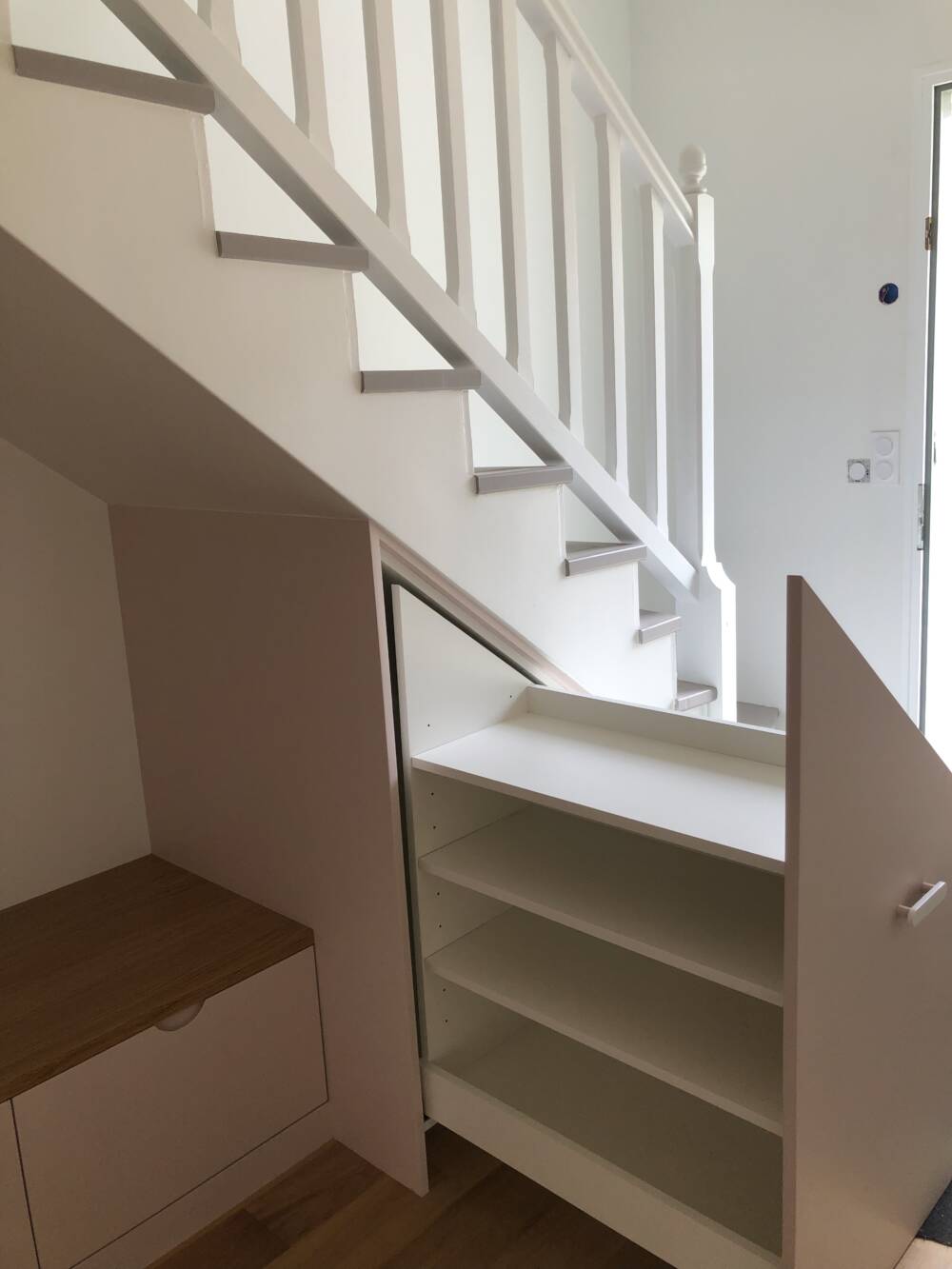 Des rangements à tiroirs ont été intégrés sous la banquette et en partie basse afin de permettre le rangement des chaussures et d’optimiser la grande profondeur de l’escalier (80 cm)