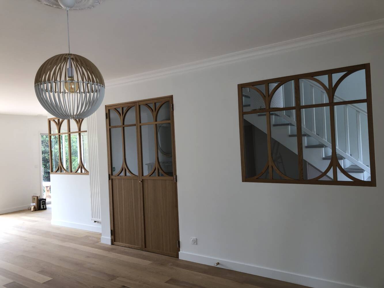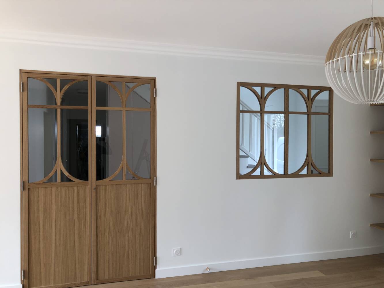 Le dessin arrondi de ces pièces a été repris à l’identique pour la porte d’accès au séjour, créant ainsi une continuité esthétique et une composition harmonieuse entre les différents espaces.