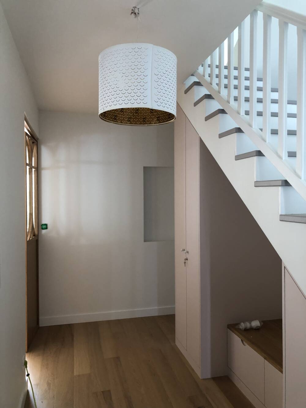 Meuble entrée : penderie et banquette sous escalier